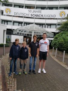Die Mannschaft von den Talbrücken war erstaunt über das Spielniveau unserer jungen Mannschaft. Der Unterschied zwischen einer Spielgruppe und einer gut ausgebildeten Mannschaft wurde ihnen sehr deutlich. Michel Fettig konnte mit seinem Wissen über Bauernendspiele aus einer ungünstigen Stellung ein Remis gegen Marnus erzwingen. Jan-Willem lockte seinen Gegner in eine clevere taktische Falle. Nach der unglücklichen Niederlage in der ersten Runde spielte Konrad konzentrierter und entschlossener und nutzte schnell einen Materialgewinn zum Sieg. Manuel zeigte keine Panik, als die Flut gegen ihn raste. Jan Boder spielte gegen den starken und geschickten Vitaliy Hotkin und konnte die komplizierte Stellung in der 1. Partie noch zu seinen Gunsten entscheiden.